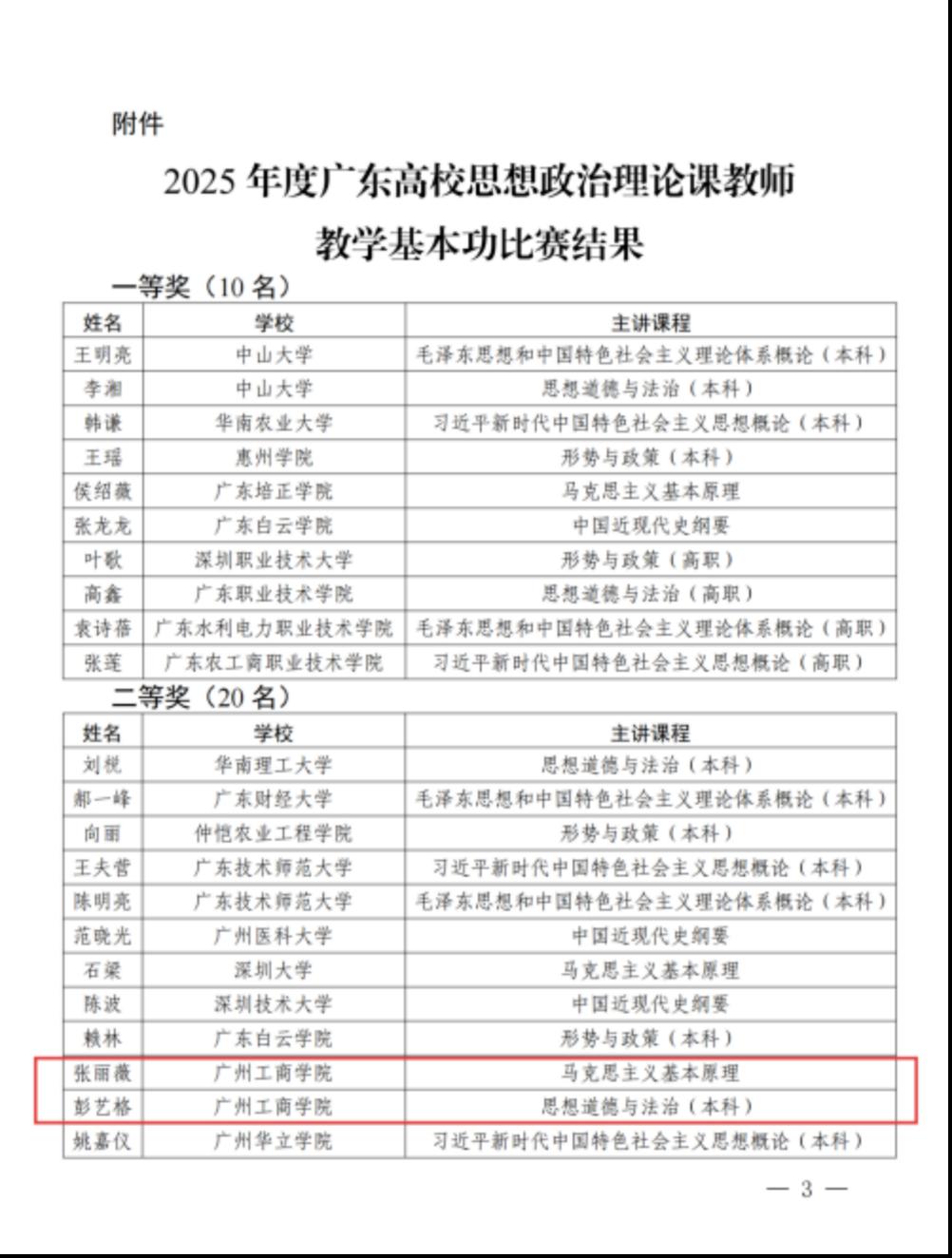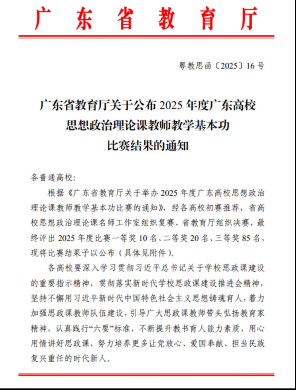 近日,广东省教育厅公布2025年度广东高校思想政治理论课教师教学基本功比赛结果,经学校初赛推荐、广东省高校思想政治理论课名师工作室组织复赛、省教育厅组织决赛,ky开元马克思主义学院彭艺格、张丽薇两位老师历经重重考验,最终脱颖而出双双荣获二等奖,首次实现该项比赛现场决赛入围率与获奖率均为100%!