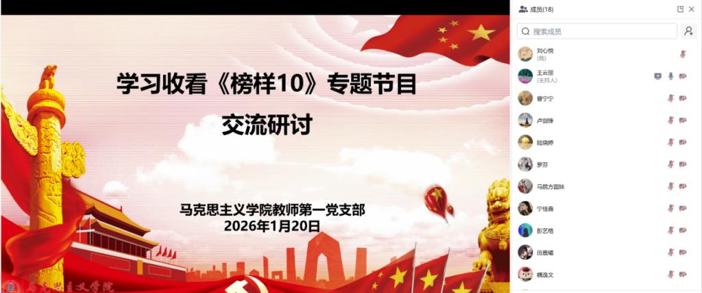 为深入学习贯彻习近平新时代中国特色社会主义思想,学习贯彻党的二十大和二十届历次全会精神,教育引导广大党员干部学习榜样、争当先进,在推进中国式现代化中奋勇争先、建功立业,马克思主义学院教师第一党支部组织党员教师们于1月20日晚学习收看《榜样10》专题节目。