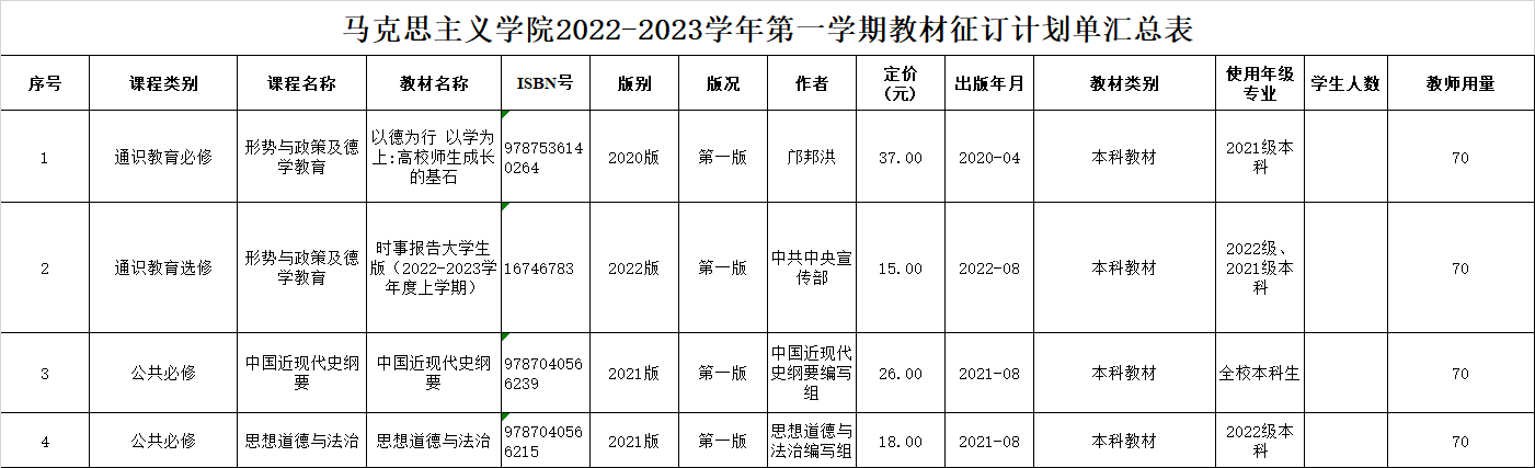 附件:《马克思主义学院2022-2023学年第一学期教材征订计划单汇总表》