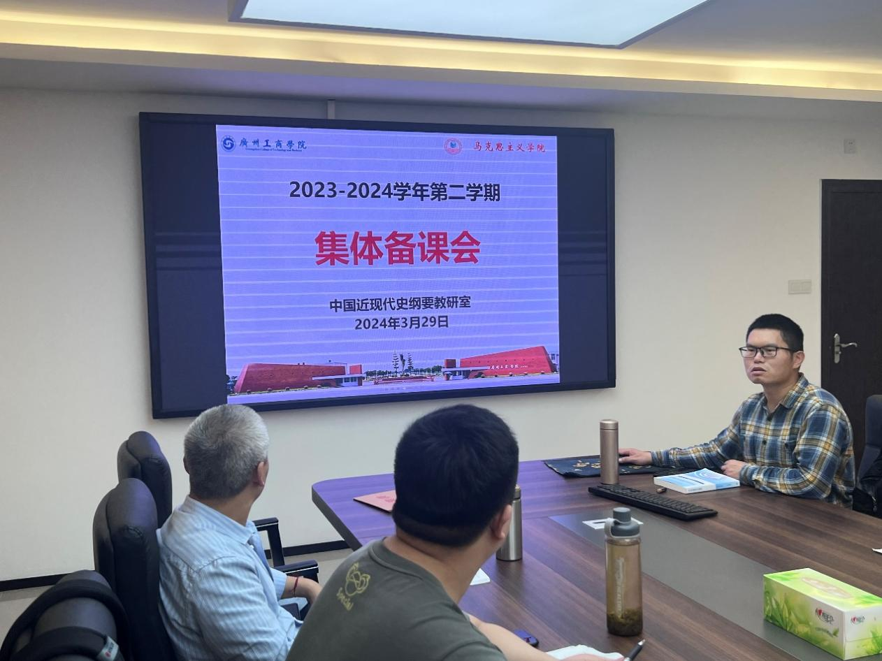 为了进一步落实马院本科教学质量的工作部署,推动思政课课堂教学质量的提升,2024年3月29日下午,马克思主义学院中国近现代史纲要教研室在图书馆4楼张辉名师工作室召开本学期第四次集体备课会。本次备课会由教研室主任江振刚老师主持,本学期担任中国近现代史纲要课程的全体教师参加。
