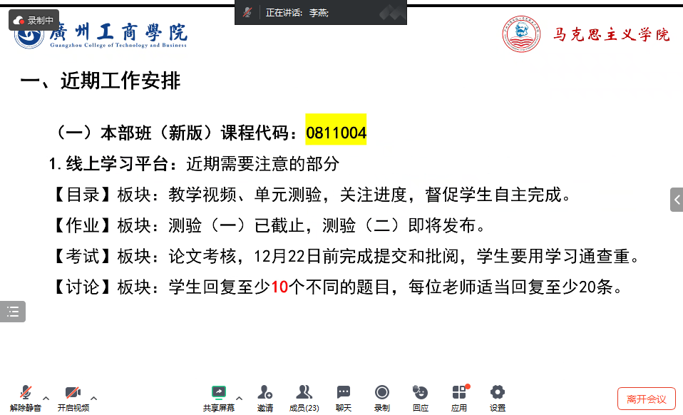 本次备课会由“教研室近期工作安排”“教学经验分享”“讨论答疑”三个环节组成。会议伊始,由马克思主义学院毛泽东思想和中国特色社会主义理论体系概论教研室课程助理李燕老师向参会老师明确了包括督促学生完成线上学习平台上的单元测试、课程论文、论坛讨论等任务;演示线上学习平台的成绩查看路径;期末考试相关工作安排等工作内容。同时,教研室主任熊玉琴副教授就教研室近期工作安排作补充说明,特别提示教师要注意期末考试方式的变化调整,做好课堂教学管理,帮助教师理清近期工作思路。