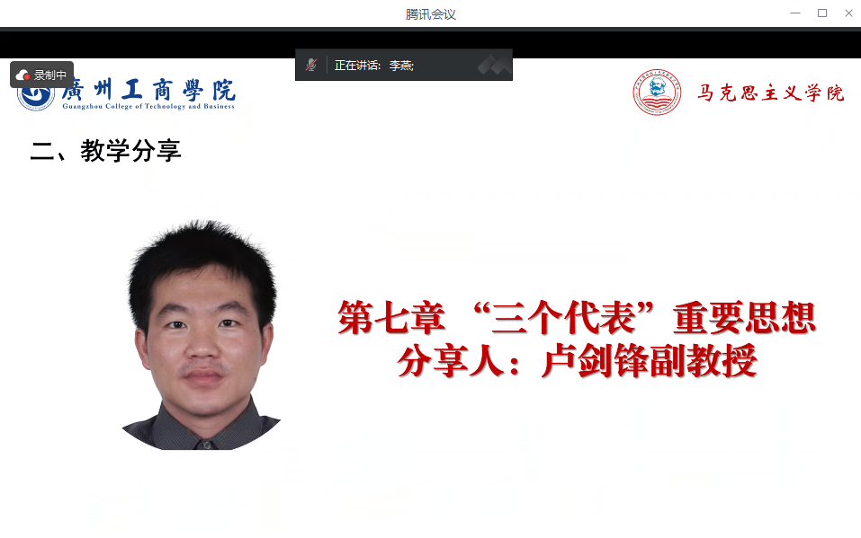 接着,卢剑锋副教授和郝建丽主任分别对教材第七章、第八章内容进行备课分享。卢剑锋副教授分别从关注的问题、难点剖析、内容分析、教学策略和教学展望五个维度进行阐释,细致地梳理了第七章“三个代表思想”的逻辑思路,深刻剖析了“三个代表思想”的核心观点、主要内容和历史地位,并对如何将现代教育技术广泛运用与教学给出了独到的建议,如灵活使用学习通“活动”功能、运用人工智能辅助教学等,对于推动教学方法创新、充实教学内容、增强理论深度以及讲清重难点问题具有重要的示范作用。