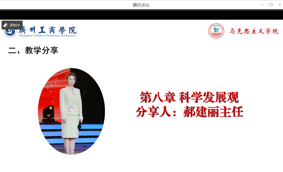 郝建丽主任从理清逻辑框架和合理搭建课堂两个方面展开第八章科学发展观的教学经验分享。郝建丽主任清晰地指出第八章的逻辑框架,科学发展观的科学内涵、主要内容和历史地位分别对应的是如何理解,如何实践和如何评价的问题。关于如何搭建课堂,郝建丽主任主要从课程教学案例的选取与使用方面进行阐释,在课程导入、知识共建等各个教学环节,郝建丽主任均分享了丰富的教学案例与视频,为与会老师如何细致地使用教学案例与视频丰富和深化课堂教学内容,提升教学效果提供了宝贵的经验指导。郝建丽主任的分享内容丰富、观点独到,对于深化科学发展观的认识与理解具有重大意义,同时也为今后的教学工作注入了新的活力与创新思路。