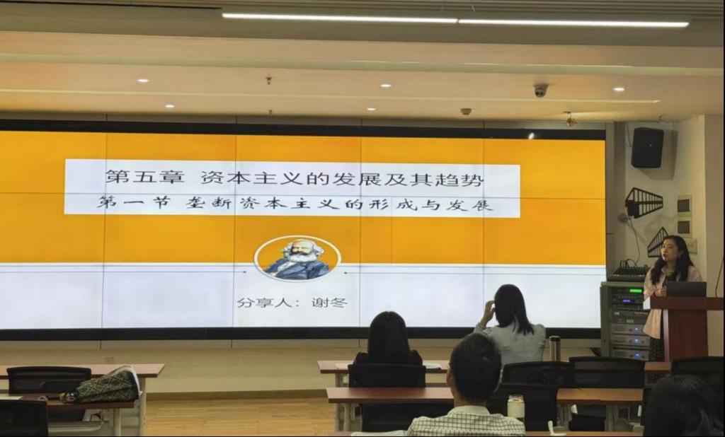 会议伊始,杨朝晖主任对本次会议的内容做了总体安排和部署,并对《原理》第四章资本主义的本质及规律进行了教学分享。杨主任通过对第四章内容的结构进行梳理帮助老师们厘清课程逻辑,她指出第一节是第四章的基础,为理解资本主义经济体系提供了理论基石;第二节是本章的核心内容,剖析了资本主义经济制度的本质;第三节则从政治和文化层面进行探讨,是对资本主义整体认识的拓展和深化。谢冬老师在对《原理》第五章第一节的教学分享中,则注重案例在教学过程中的作用。她运用戴比尔斯在钻石行业进行垄断的案例、皮耶鲁齐在法国阿尔斯通工作的案例以及三星集团操纵韩国经济的案例等等将理论融会贯通。她指出,案例不仅可以帮助学生更好地理解理论内容,还可以调动课堂氛围,提高学生的课堂参与度,增强学生的课堂主人翁意识。