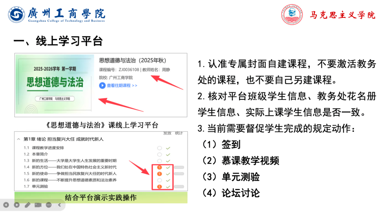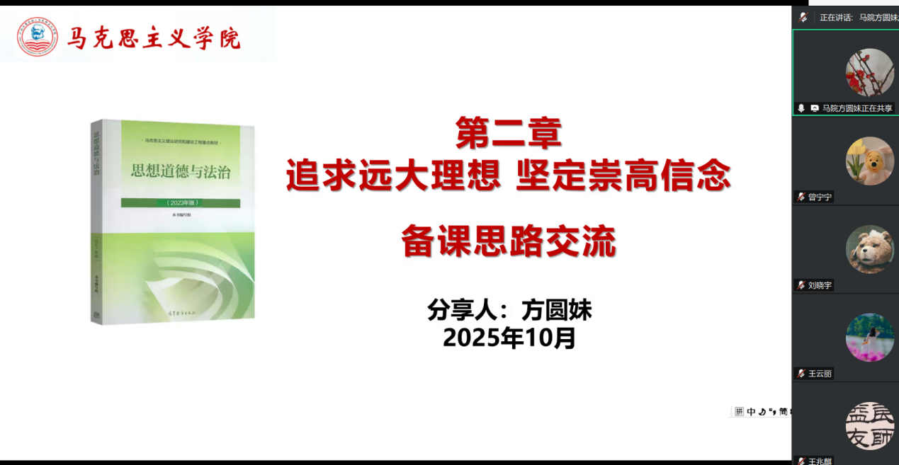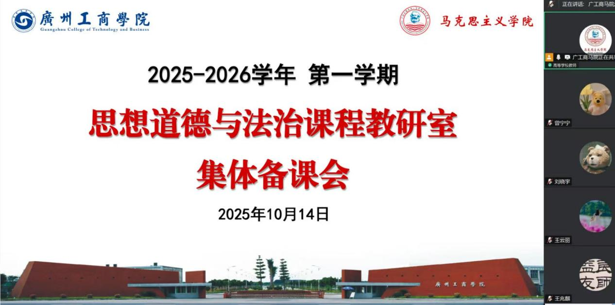 为进一步提升教学质量和效果,凝聚教学智慧,2025年10月14日晚,马克思主义学院思想道德与法治课程教研室在线上召开了本学期第三次集体备课会。会议由教研室主任彭艺格老师主持,全体授课教师参加。全体成员齐聚“云端”,围绕教学平台使用与课程内容设计两大主题,展开了深入的交流与探讨。