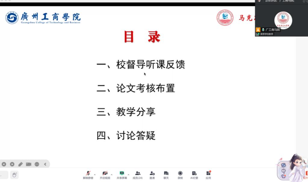 会议第一项议程由彭艺格主任介绍近一周校督导听课反馈情况,总体来说马院教研室集体备课准备充分,教学材料齐全,教师能够根据课程内容及学情有针对性地撰写教学反思。教师教风仪态较好,具有较强亲和力。同时建议马院老师要引导和鼓励学生前排就座,大胆进行课堂管理。