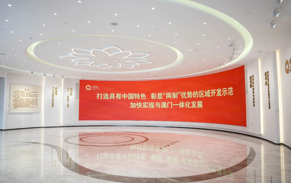 珠海横琴毗邻澳门,土地面积是澳门的三倍,2021年9月起由澳门特区政府和广东省政府共同管辖。天沐琴台是澳门回归祖国25周年之际完工的新地标,横琴规划展览馆就坐落于此。在展厅内,老师们观看了《琴澳和鸣——横琴粤澳深度合作区建设主题展》,认真学习了习近平总书记2024年12月考察横琴粤澳深度合作区时的重要讲话内容,深入了解横琴发展的战略定位与实践成果。主题展分为“同根同源血脉连”“感恩奋进淬初心”“琴澳和鸣谱新篇”“一体发展创未来”四部分内容,用沙盘模型、数字影像等现代化展陈方式,立体展示了横琴粤澳深度合作区在制度创新、产业协同、民生融合等方面的发展成果与规划蓝图。