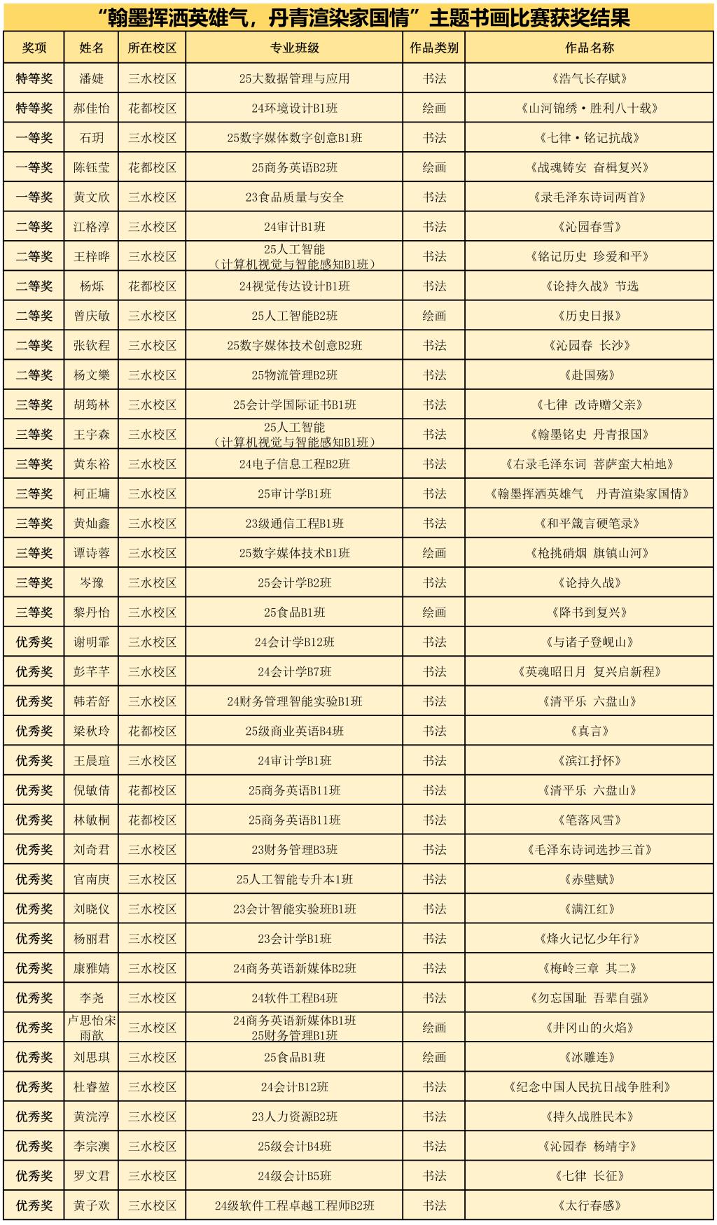 为深入学习贯彻党的二十届四中全会精神,弘扬中华优秀传统文化与革命文化,进一步推动学校美育建设,引领广工商师生在笔墨中感悟英雄精神、厚植家国情怀,由马克思主义学院教师第三党支部联合会计学院学生第四党支部举办的2025年“翰墨挥洒英雄气,丹青渲染家国情”书画比赛及展览活动近日圆满落幕。