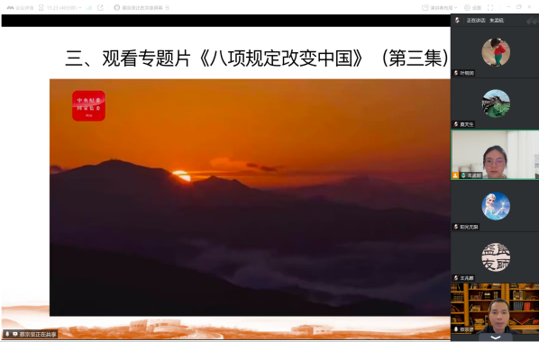 会议议程第三项,观看专题片《八项规定改变中国》。屏幕上一个个因违反中央八项规定被查处的案例、一组组作风建设的成效数据,让在场党员深受触动。该片以纪实手法展现了中央八项规定实施以来,党风政风、社风民风的深刻转变,从遏制“舌尖上的浪费”到整治“车轮上的腐败”,从压缩会议文件到规范公务接待,生动诠释了“作风建设永远在路上”的深刻内涵。观影结束后,党员们纷纷表示,专题片既是警示教育,也是精神洗礼。作为高校思政课教师,我们更要以身作则,把严的作风融入教书育人全过程。