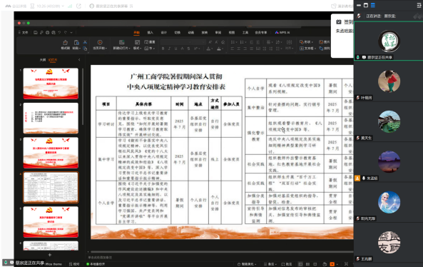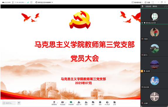 为深入贯彻中央八项规定精神学习教育,持续推进全面从严治党向基层延伸,强化党员干部的纪律意识与作风建设,7月25日,马克思主义学院教师第三党支部在线上召开党员大会。会议围绕暑期学习教育部署、专题学习研讨、作风查摆等议程展开,支部全体党员参加会议,支部书记蔡宗坚副教授主持会议。
