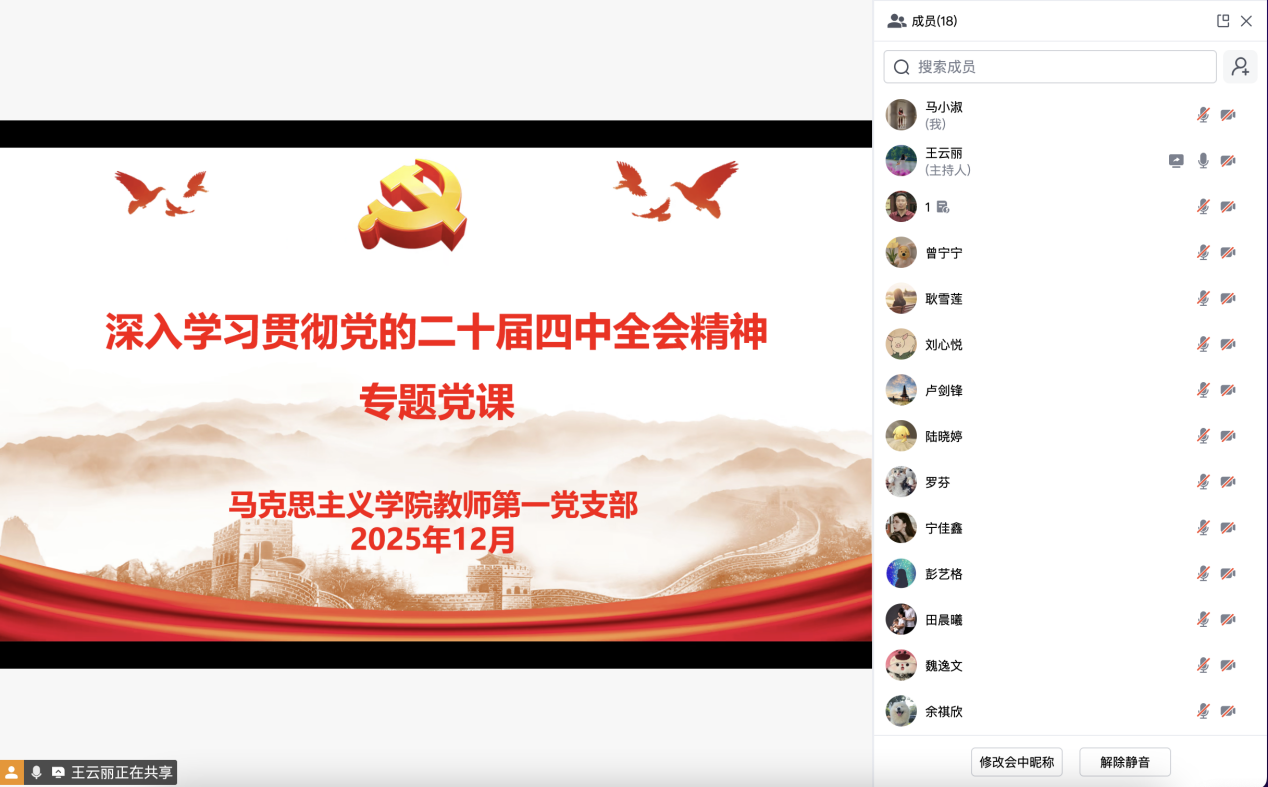 为深入学习贯彻党的二十届四中全会精神,准确把握新时代推进国家治理体系和治理能力现代化的目标任务与战略部署,12月3日晚,马克思主义学院教师第一党支部通过腾讯会议线上开展深入学习贯彻党的二十届四中全会精神专题党课。会议由党支部书记王云丽主持,支部全体教师党员参会学习。