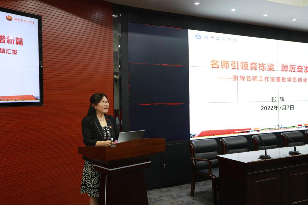 总结会在会议主持人热情洋溢的欢迎辞中拉开了序幕。张辉名师工作室主持人张辉教授以《名师引领育栋梁踔厉奋发谱新篇》为题,从“建章立制,搭建成长共同体”、“六大工程,促进学员提升能力”、“成果丰硕,彰显学员多样风采”、“百尺竿头,持续发挥示范引领作用”这四个方面作了精彩的汇报。她指出,张辉名师工作室以“理论学习提升工程、教学能力提升工程、科研能力提升工程、管理能力提升工程、社会实践与志愿服务工程、‘以学生为中心’的实践育人工程”六大工程为抓手,促进学员提升教学、科研以及管理服务等能力,为落实立德树人根本任务,培养高素质应用型人才奠定良好的基础。两年来,在专家导师的引领下,学员们锐意进取,努力奋进,取得了较为丰硕的成果:发表论文共32篇,其中独撰论文22篇;各级各类课题立项31项,其中市厅级以上项目5项:编著1部(主编或参编)﹔共获得各级各类奖项高达79项,其中较为突出的奖项有14项(市厅级以上奖项),在教学、科研、管理、指导学生四个方面表现甚佳,成绩喜人。目前第二批学员已经招募完毕,工作室将持续发挥名师示范引领作用,积极构建学校党建、思政学习共同体,培育党建与思政优质人才,为学校的高质量发展而服务。
