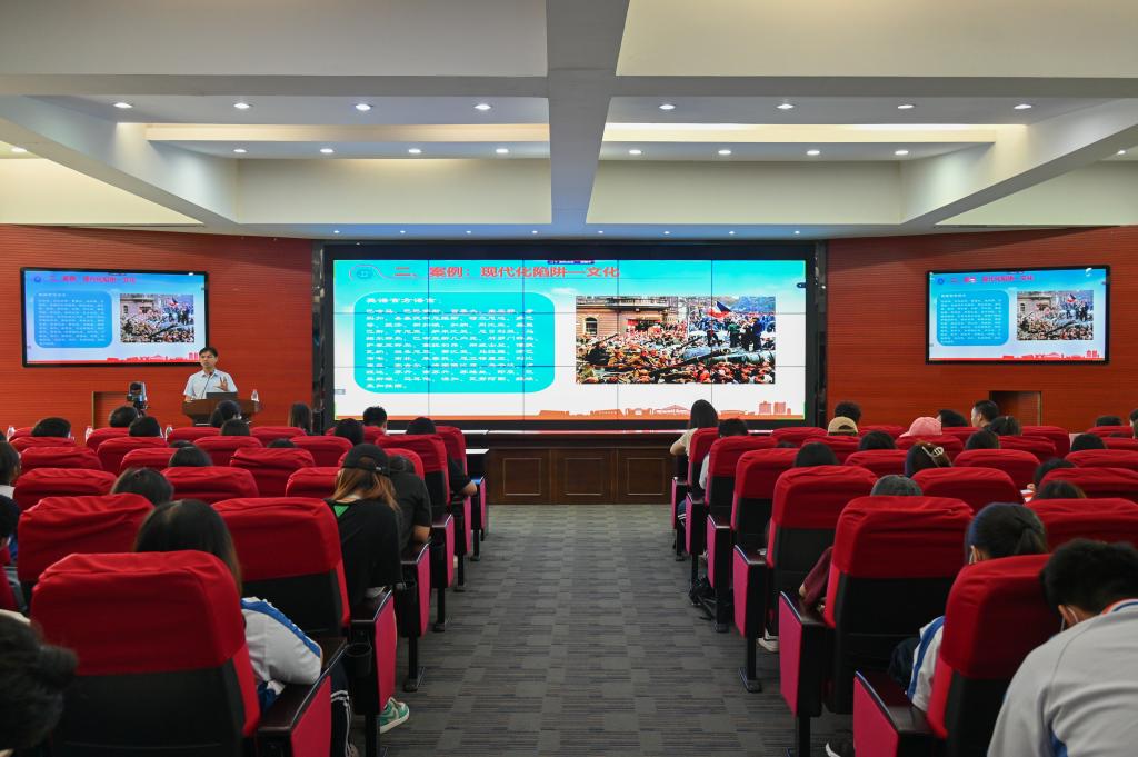 王校长节选毛泽东、邓小平、江泽民、胡锦涛和习近平等历代中国共产党领导人关于“中国走现代化道路”的重要论述,引经据典系统阐释和厘清了“中国式现代化”提出的历史背景与理论逻辑。他提到,我国曾有辉煌灿烂的古代文明,但错失了多次现代化发展的机遇,且现代化进程屡遭挫折,目前的现代化成效来之不易。我国基于国情与历史传统,努力克服难题,突破西方现代化理论的框架,对西方现代化理论与实践的摒弃与超越,走出一条独特的中国式现代化道路,成功推进和拓展了中国式现代化,成绩斐然,充分说明了“中国为什么行”。同时,他也提醒同学们,中国目前与美国等发达国家相比仍然存在一定的差距,大家要时刻保持清醒的认知,继续努力奋斗。