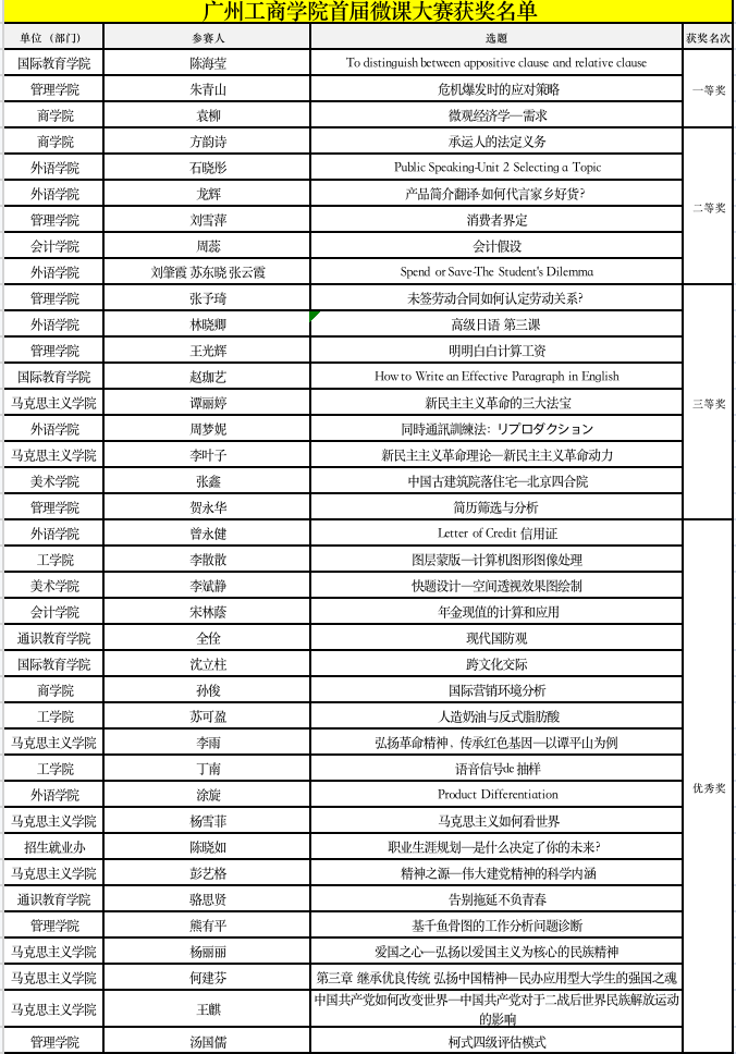 本次比赛从2021年12月拉开帷幕,历时近四个月,全校各教学单位(部门)纷纷响应,近百名选手摩拳擦掌,各显神通,集中一个月录制了共近百份微课作品,涵盖了外语、思想政治教育、管理学、会计学、美术设计等不同学科。经初审评委的认真筛选,38份微课作品突出重围,进入决赛阶段。4月25日—5月10日,入围决赛的微课作品在马院微信公众号进行线上展示及投票。历时两周的微课作品网络展评反响热烈,30000+人次参与投票,总票数高达三万余票,得到全校师生的大力支持。同时,由专家组评委进行专业、公平的评分。根据《关于举办ky开元集团官网首届微课大赛的通知》要求,大赛本着公平、公正、公开的原则,综合教育专家评委团分数(60%)和网络投票分数(40%),得出最终的成绩,共评选出一等奖(3个作品),二等奖(6个作品),三等奖(9个作品),其余入围决赛圈的作品都为优秀奖。(如图所示)另外,综合各单位(部门)所提交的作品总数量及决赛入围率,本次大赛还评选出三个优秀组织奖,他们分别是外语学院、管理学院和马克思主义学院。