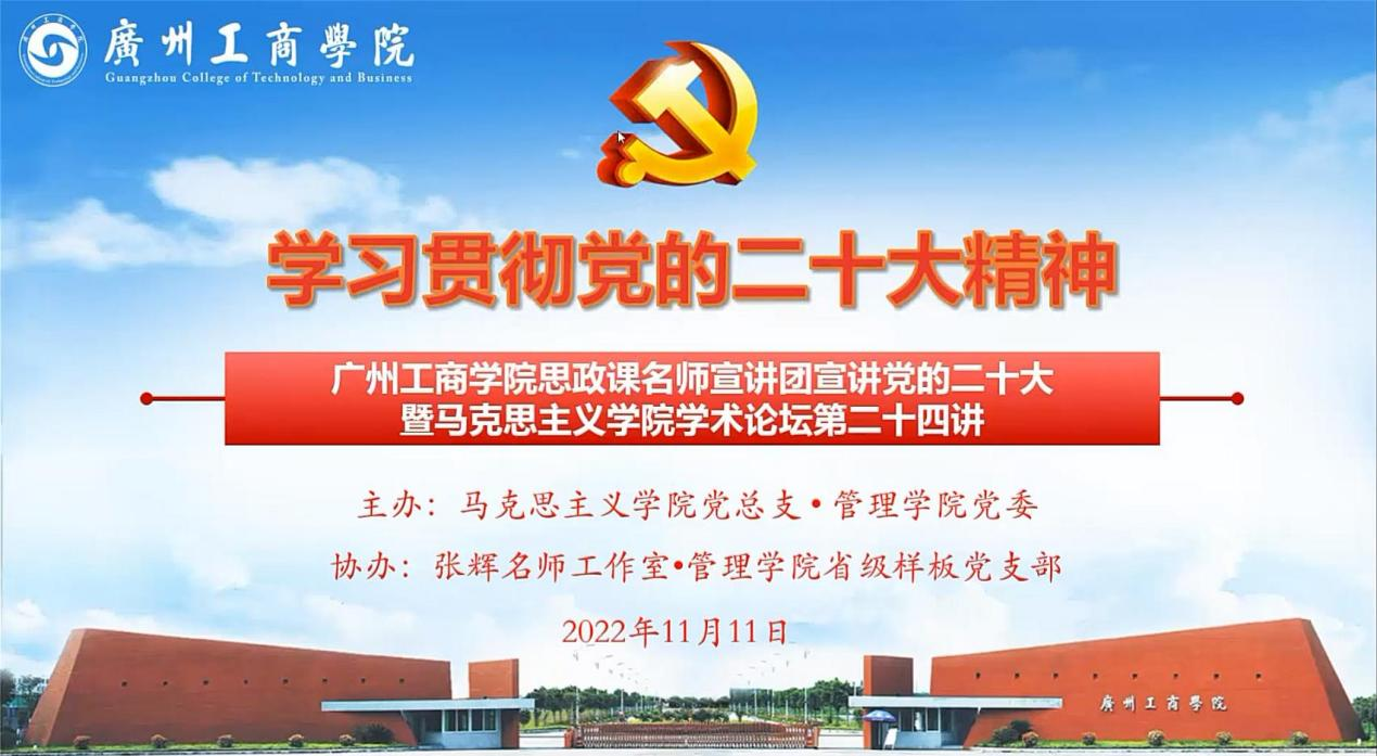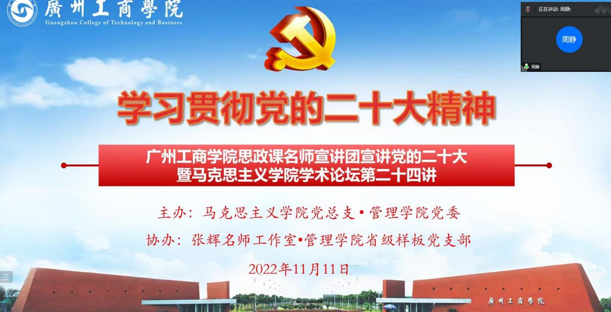 为了落实中共中央关于认真学习宣传贯彻党的二十大精神的决定,深入学习贯彻党的二十大精神,根据ky开元集团官网党委的部署要求,11月11日下午,马克思主义学院党总支和管理学院党委联合主办,张辉名师工作室和管理学院省级样板党支部协办的ky开元集团官网思政课名师宣讲团宣讲党的二十大精神(第一场)暨马克思主义学院学术论坛第二十四讲以在线会议形式开讲。本次宣讲由马克思主义学院范金良教授主讲,学校党委副书记、副校长兼马克思主义学院院长、张辉名师工作室主持人张辉教授出席,马克思主义学院党总支书记常务副院长周静担任主持,马克思主义学院全体教师党员、管理学院党委及师生党员代表和张辉名师工作室第二批学员共计300多人聆听了宣讲。