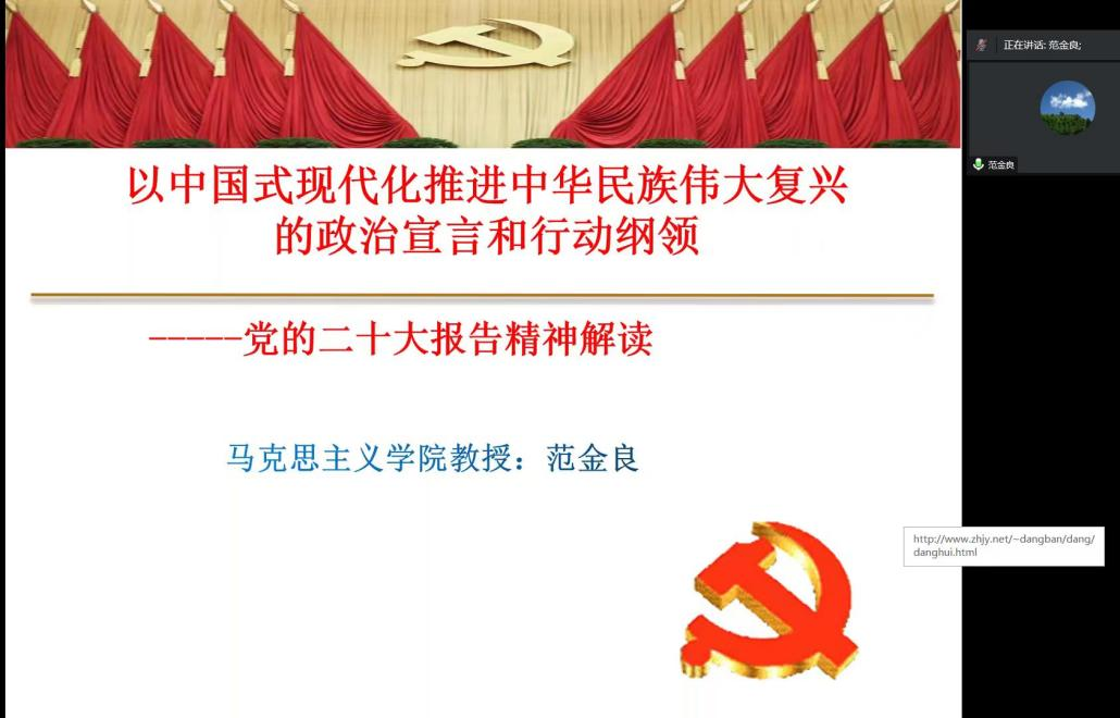 范金良教授从五个方面系统阐释党的二十大精神:其一是高瞻远瞩。报告提出主题、旗帜、道路、目标方向等关系党和国家至关重要的重大问题。高举中国特色社会主义伟大旗帜,全面贯彻习近平新时代中国特色社会主义思想,弘扬伟大建党精神,自信自强、守正创新,踔厉奋发、勇毅前行,为全面建设社会主义现代化国家、全面推进中华民族伟大复兴而团结奋斗。他指出,报告总结了过去五年的工作和新时代十年取得的伟大变革,而党确立习近平同志党中央的核心、全党的核心地位,确立习近平新时代中国特色社会主义思想的指导地位,反映了全党全军全国各族人民共同心愿,是党的十八大以来我们党作出的重大政治抉择,是新时代十年最重要的政治成果,也是取得伟大变革的根本原因,对新时代党和国家事业发展、对推进中华民族伟大复兴历史进程具有决定性意义。其二是理论创新。开辟马克思主义中国化时代化新境界—习近平新时代中国特色社会主义思想。党的二十大报告提出要不断谱写马克思主义中国化时代化新篇章,首先要把握好习近平新时代中国特色社会主义思想的世界观和方法论,必须坚持人民至上,坚持自信自立,坚持守正创新,坚持问题导向,坚持系统观念,坚持胸怀天下。习近平新时代中国特色社会主义思想科学内涵、主要内容、世界观和方法论共同构建了习近平新时代中国特色社会主义思想体系。其三是擘画蓝图。报告明确了全面建设社会主义现代化强国的实践途径,以中国式现代化推进中华民族伟大复兴,分为两步走,把握重要原则,发扬斗争精神,增强忧患意识、增强全国人民的志气、骨气、底气,经受重大风险挑战,开辟中国特色社会主义现代化国家新天地。其四是系统推进。报告全面部署全面建设社会主义现代化国家的大政方针和工作任务;全面建设社会主义现代化国家要把握高质量发展这一首要任务,以教育、科技、人才为基础性、战略性支撑,发展全过程人民民主,坚持全面依法治国,为民造福。其五是根本保障。报告指出要坚定不移全面从严治党,找到党跳出历史周期率的第二个答案,坚持自我革命、自我净化,深入推进新时代党的建设新的伟大工程。