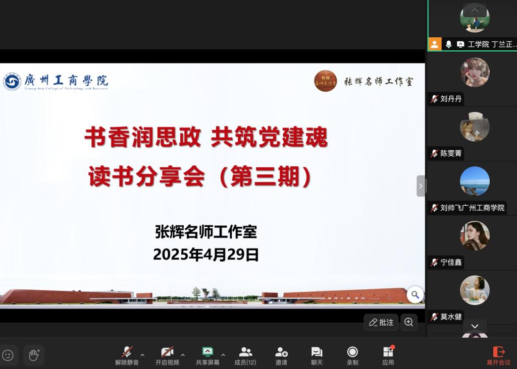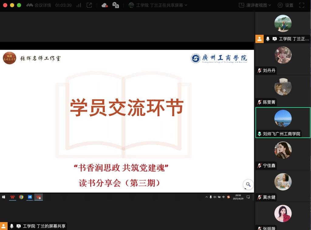 为深入贯彻落实习近平总书记关于全民阅读的重要讲话精神,弘扬“以德为行 以学为上”教育理念,积极践行“五进”之进图书馆教育实践活动,全面提升工作室学员的综合素养,发挥名师工作室的示范引领作用,助推学校党建和思想政治工作队伍的专业化发展,4月29日晚,张辉名师工作室举办“书香润思政 共筑党建魂”主题读书分享会(第三期),工作室第三批学员参加分享交流。分享会由学员丁兰老师主持。