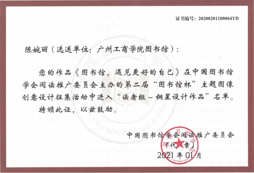 本次活动主题为“图书馆,让生活更美好!”和“战‘疫’,读书人的力量!”,面向全国图书馆馆员和读者,征集与主题相关的海报、插画、漫画、表情包、卡通形象五类图像作品。据悉,全国共计1125个图书馆组织参赛,28801人报名,通过审核的作品28352件。经过激烈的角逐,ky开元陈婉丽同学的作品《图书馆,遇见更好的自己》荣获“铜星设计作品”称号,谢广成同学的作品《博“疫”》荣获“星级设计作品”称号,董美榕等9位同学的作品分别荣获“新锐设计作品”称号。