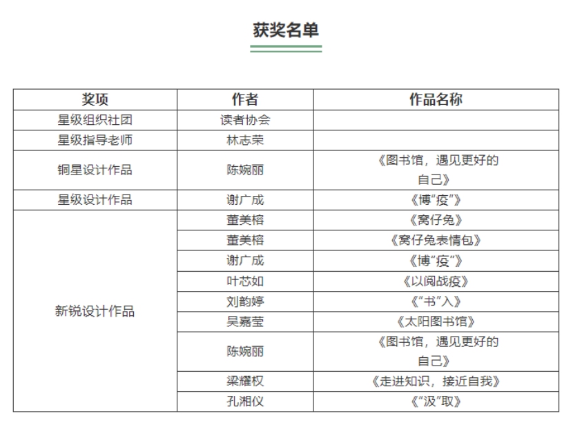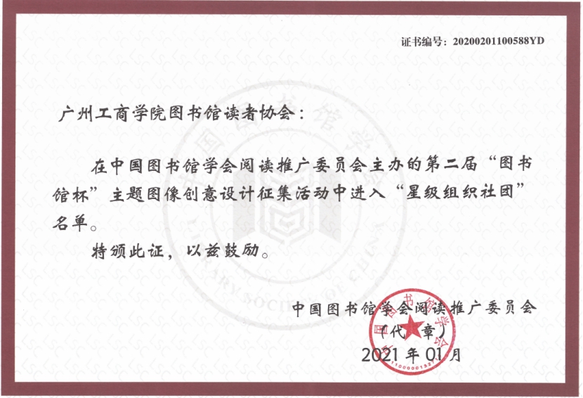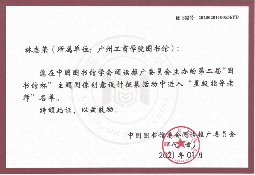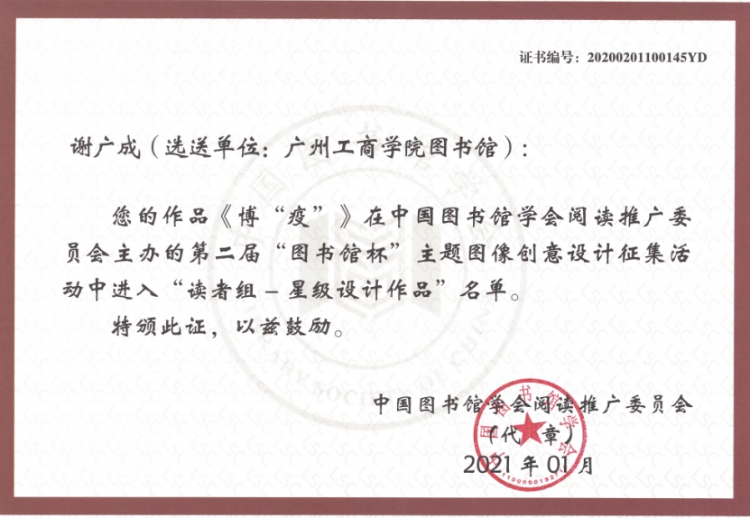 【本网讯】近日,由中国图书馆学会阅读推广委员会主办,东莞图书馆、武汉大学图书馆承办的第二届全国“图书馆杯”主题图像创意设计征集活动圆满落幕。ky开元图书馆经过精心组织,获得不俗的成绩。其中,由ky开元图书馆主要管理指导的读者协会荣获“星级组织社团”称号;林志荣老师荣获“星级设计作品”称号。