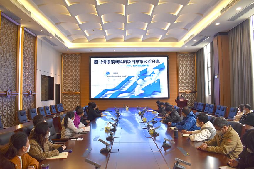 为了营造良好的科研氛围,让各领域专业技术人员都积极投入到科研工作中去,12月14日下午,在花都校区图书馆412会议室,科研处和图书馆联合举办了工商大讲堂2022年第五期暨图书情报人员科研能力提升学术讲座第1期,广东技术师范大学图书馆副研究馆员覃燕梅做了“图书情报领域科研项目申报经验分享”的主题报告。学校图书馆硕士以上学位和图书资料系列中级职称以上人员、广州城市理工学院图书馆郭培虹馆长及馆员代表参加了讲座,讲座由图书馆馆长回雁雁主持。