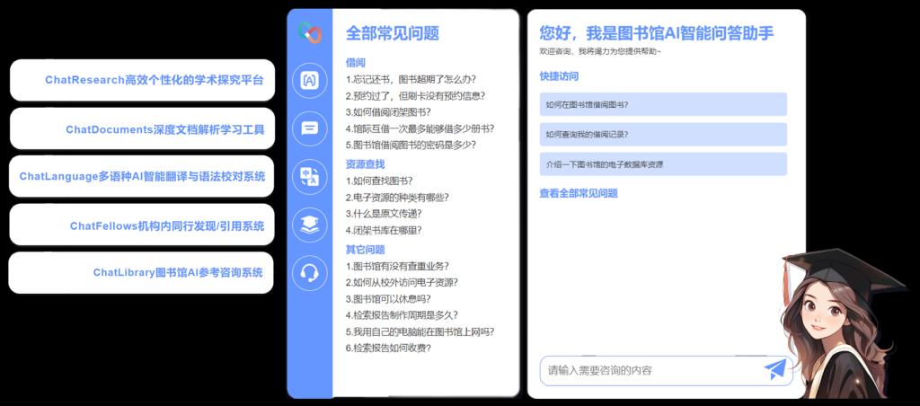 是图书馆的专属AI咨询助手,为老师和学生提供精准理解和智能回答,同时增加专业学科馆员知识库,满足日常问答的同时,提供更专业的学科服务。