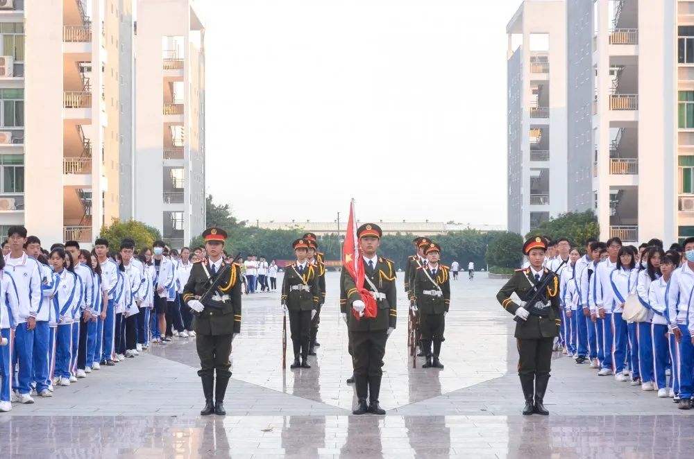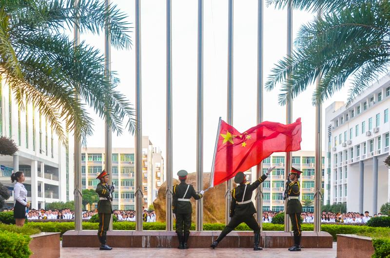 国旗护卫队的旗手们随着一声令下,踏着整齐而稳健的步伐,庄严地将国旗护送至升旗台前,全体肃立,升国旗、奏国歌并行注目礼,鲜艳的五星国旗冉冉升起。