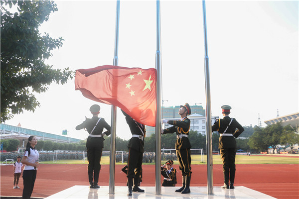 迎着清晨的朝阳,伴随着雄亮的国歌声,在全体新生的庄严注视下,鲜艳的五星红旗冉冉升起。