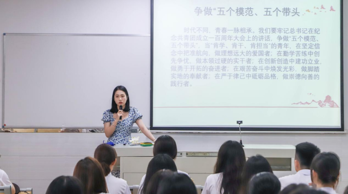 9月12日。校学生会邀请校团委副书记,校学生会秘书长为团支部开展专题授课。她以《紧跟伟大的党,续写青春荣光》的主题,回顾党领导下的中国青年运动百年历程,引导和激励学生会的青年骨干紧跟党走,成为党的助手和后备军,坚持理论学习与实践锻炼相结合,服务青年思想成长。