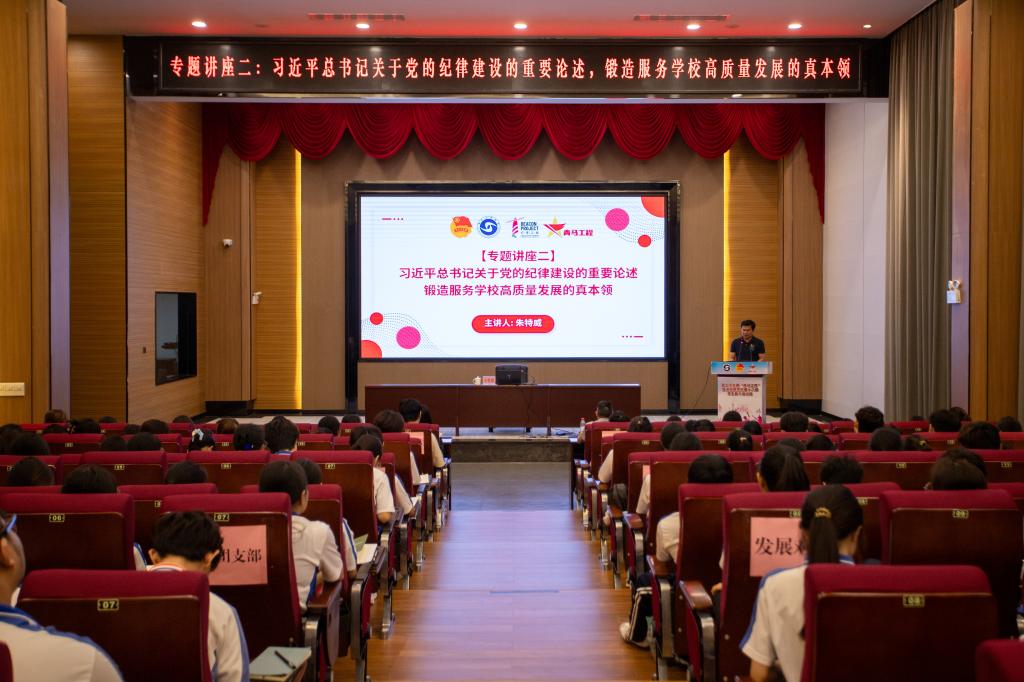 朱特威同志从“学习习近平总书记关于纪律建设的重要论述”“始终把牢全面从严治团的根与魂”等三个方面,以理论+案例的方式,为学校师生党员、入党积极分子、入党发展对象以及青马工程学员等上了一堂生动的党纪学习教育课。他强调:全体师生要全面领会习近平关于党的纪律建设的重要论述,深刻认识开展党纪学习教育的重要性与必要性,做到律己从严、执纪从严,心有敬畏、言有所戒、行有所止;各级团组织要纵深推进全面从严治团,要始终把严明政治纪律和政治规矩放在首位,对照“四铁”标准,争当一名好党员、好团员、好学干,助力学校教育事业高质量发展。