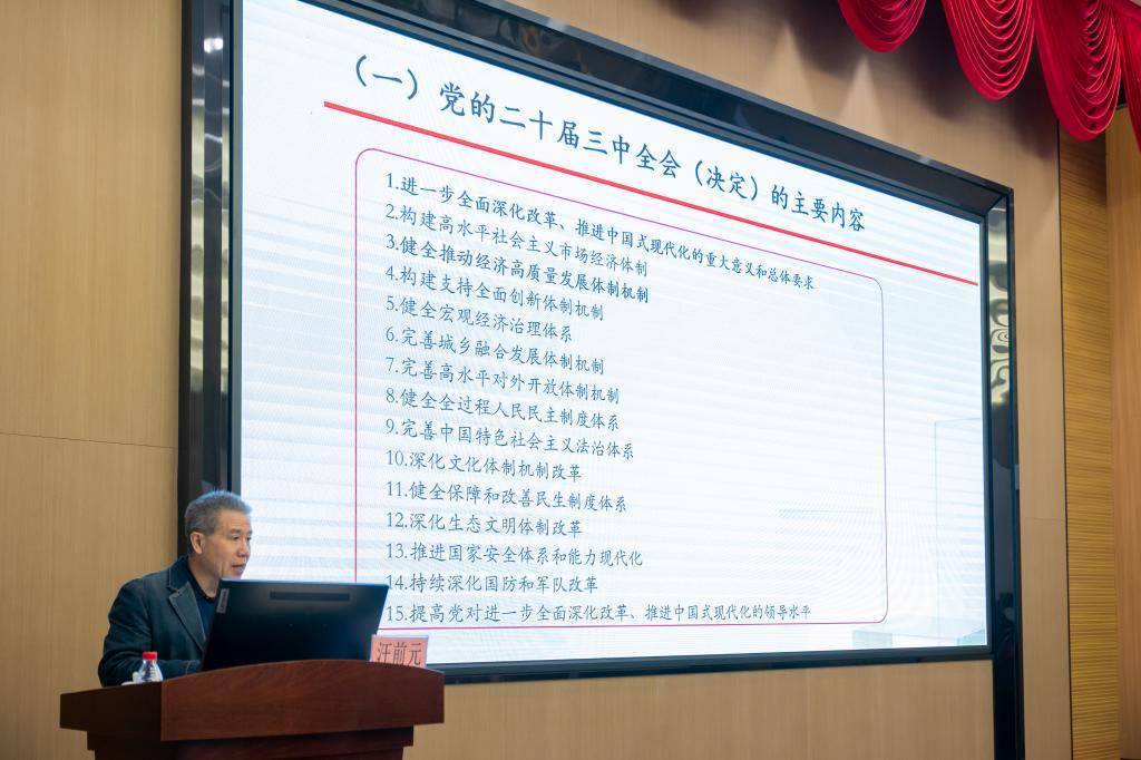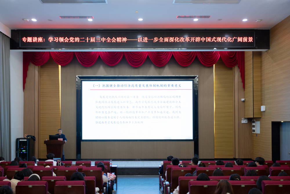 为深入学习贯彻党的二十届三中全会精神,广泛凝聚青年学生对进一步全面深化改革共识,激发青年学生的使命感和责任感,筑牢全党全社会共抓改革的思想基础、群众基础,新时代新征程上把中国式现代化不断推向前进。12月18日,副校长汪前元教授在ky开元花都校区图书馆415报告厅为花都校区各班级组织委员、负责创新创业的学生干部讲授了以“学习领会党的二十届三中全会精神——以进一步全面深化改革开辟中国式现代化广阔前景”为主题的专题讲座。