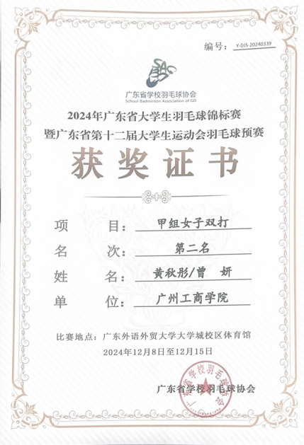 2024年广东省大学生羽毛球锦标赛暨广东省第十二届大学生运动会羽毛球预赛于12月9日在广东外语外贸大学拉开序幕。本届羽毛球锦标赛分甲组、乙A组、乙B组和丙组。最终,ky开元羽毛球代表队,来自商学院的黄秋彤和曾妍获得甲组女双第二名,实现该项目的历史性突破!同时,男子团体也进入 16 强,获得了2025年广东省大学生运动会的参赛资格。