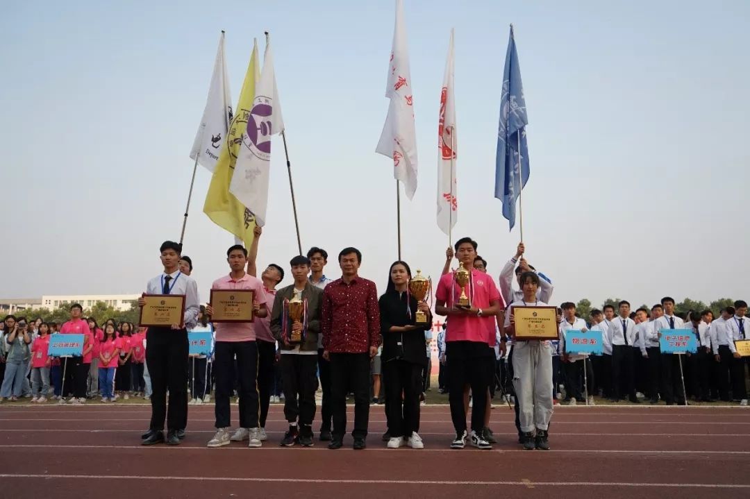 副总裁判长陈强宣布团体总分和体育道德风尚奖名单。朱特威副院长为团体总分前三名获奖单位颁奖,黄鹏处长为团体总分第四、五、六名和“体育道德风尚奖”获奖单位颁奖,洪卫烈书记为广播体操比赛前六名获奖单位颁奖。