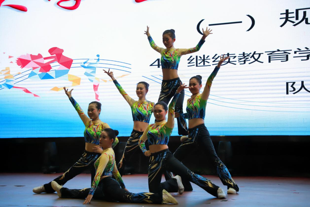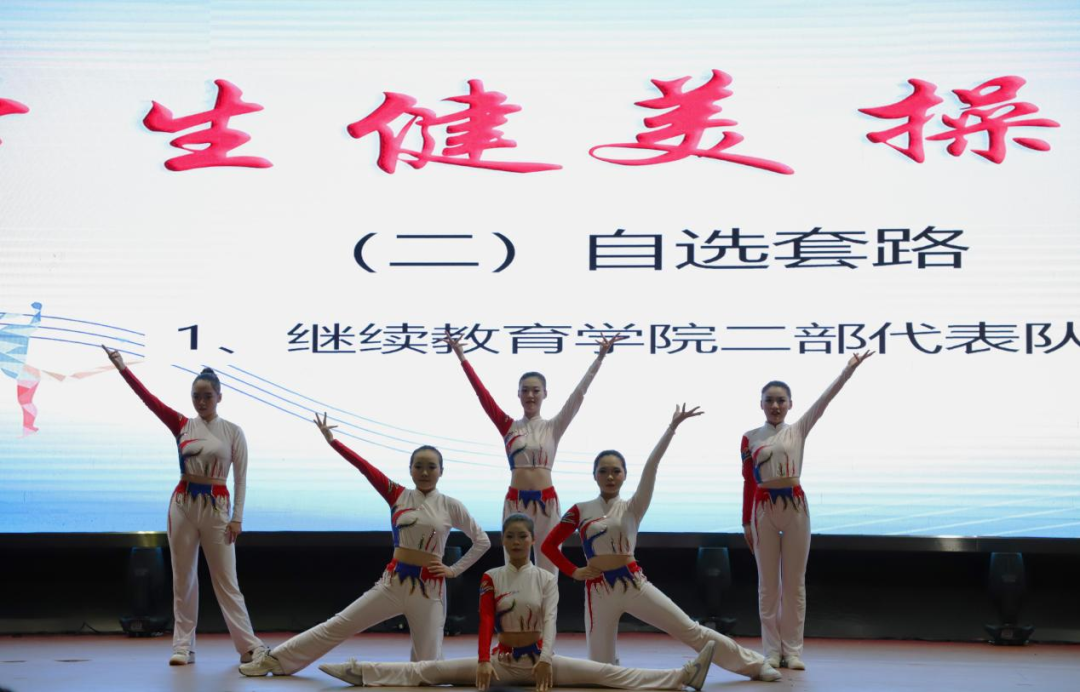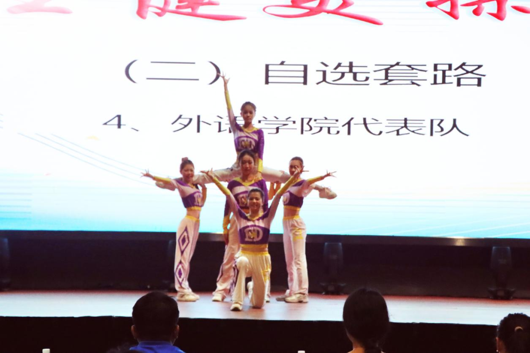 本次共有4个学院、9支队伍的77名学生分别参加规定动作和自选动作的比赛。在比赛中,9支代表队在比赛中舞动青春,展现自我。比赛现场,各学院代表队依次登场。他们身着色彩鲜艳的队服,宛如灵动的精灵。随着动感的音乐响起,队员们迅速进入状态,动作整齐划一,活力满满。跳跃、旋转、伸展,每一个动作都充满力量与美感,将健美操的魅力展现得淋漓尽致。为全场观众奉上了一场青春时尚,激情四射的健美操表演。台下的观众也似乎受到感染,欢呼声此起彼伏。虽然她们的表现离专业水准还有一定距离,但这份纯真与活泼,别具韵味,充分展现了团队合作的精神和新时代大学生的朝气和活力。