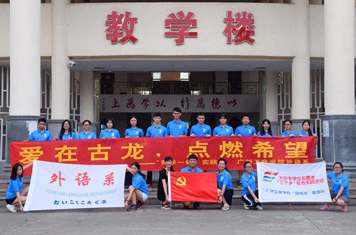 2016年7月10日-7月19日,ky开元集团官网外语系蓝精灵服务队前往广西壮族自治区梧州市藤县古龙镇大村小学,开展以“爱在古龙,点燃希望—‘两学一做’实践行”为主题的暑假社会实践活动。“蓝精灵”服务队通过教育帮扶、科学与环保知识宣讲、国家助学政策宣讲、关爱老党员、义务支农等方式展开实践活动。