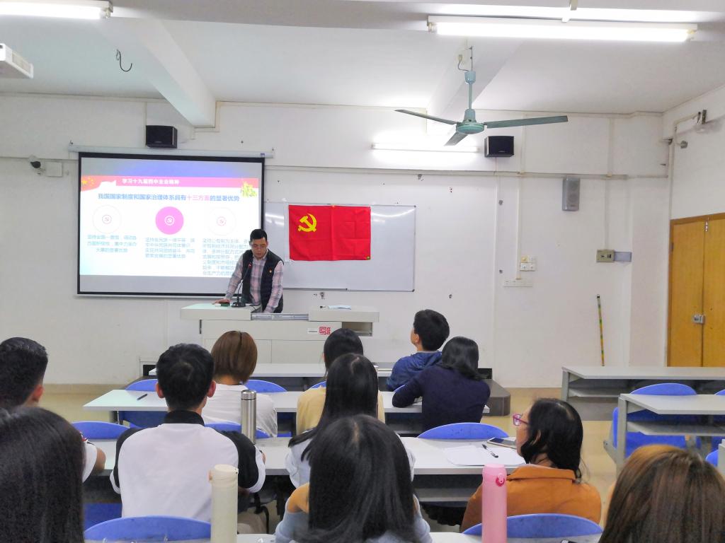 2019年11月21日12时30分,外语系学生第一党支部为深入学习和贯彻党的十九届四中全会精神,传达近期学校党委工作要求,安排部署各项主题教育工作。