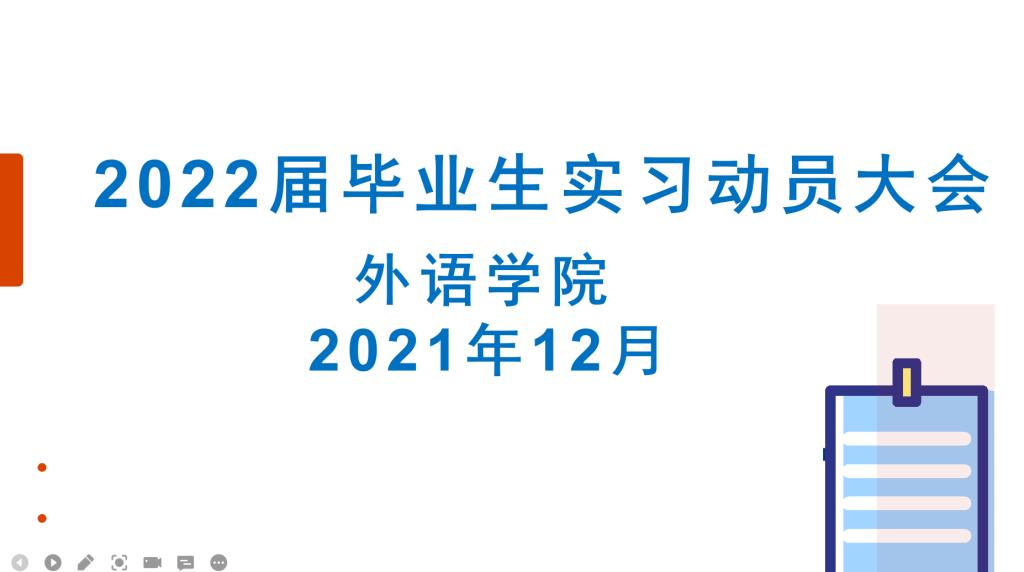 晚上19时,2022届毕业生实习动员大会正式开始,担任本次动员大会的主持人是外语学院覃青霞老师。覃老师首先介绍了出席本次实习动员大会的老师,莅临今晚会议的有:外语学院副院长谢秀珍老师、教学秘书申卫红老师、学工办主任王林老师、学工办副主任董理政老师、2018级辅导员老师。