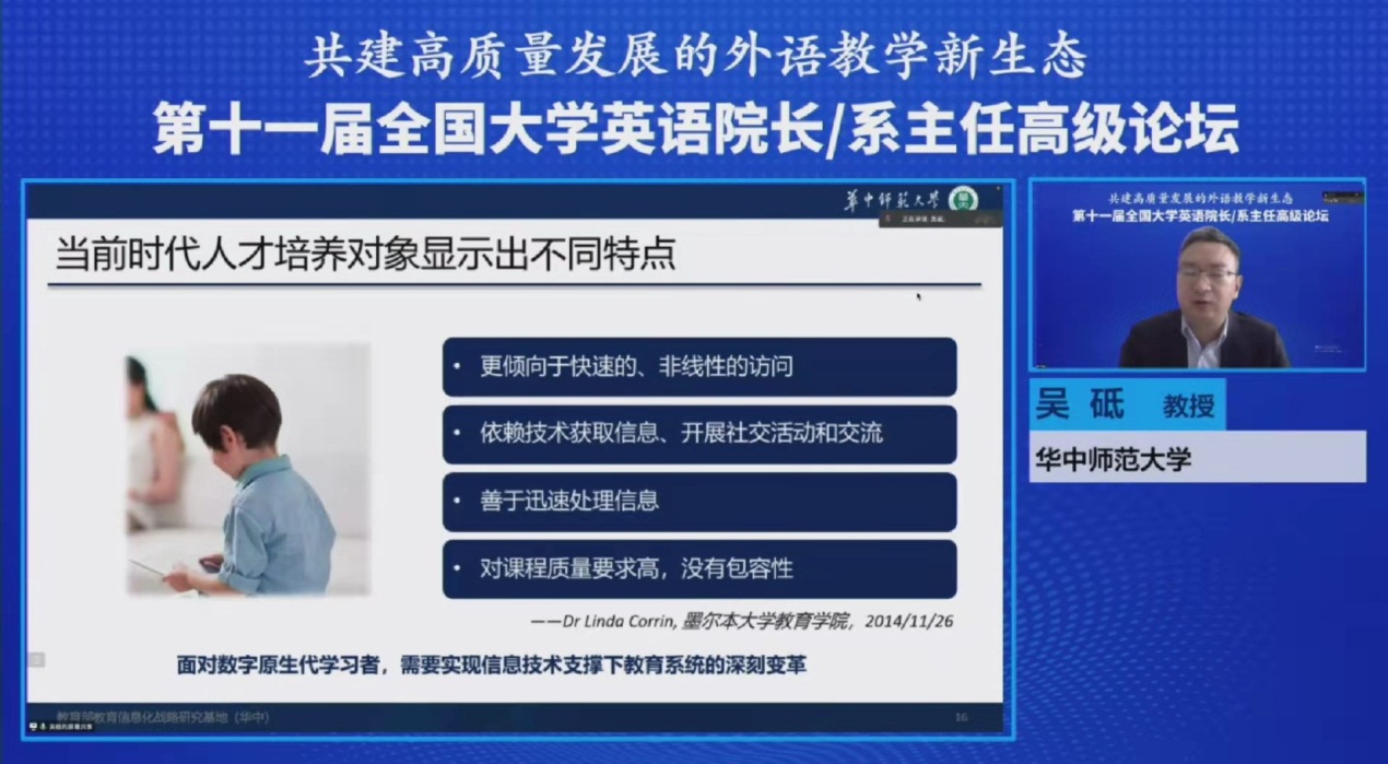 本届论坛主题为:共建高质量发展的外语教学新生态,主要聚焦于数字化、网络化、智能化背景下,如何利用教育信息技术、语言智能技术、数字资源环境助推大学英语课程思政改革、大学英语智慧教学、一流课程建设以及优质数字资源开发等。4月9日下午四点由宁夏大学朱海燕副教授发表的主题为“基于信息化的大学英语分级分层多维教学体系构建与实践”的主旨讲话中强调:要进一步实践教学模式信息化,推进在线课程建设,实施《大学英语》SPOC课程教学,主要方法为:慕课录制和上线;实施“线下”(读写课程)+线上(听说课程)的教学模式;“FIF口语APP”+“线下口语测试”相结合;利用“智慧教室”开展研讨形式,反转形式教学。采用多套试题运行的方式实施“无纸化”考试。