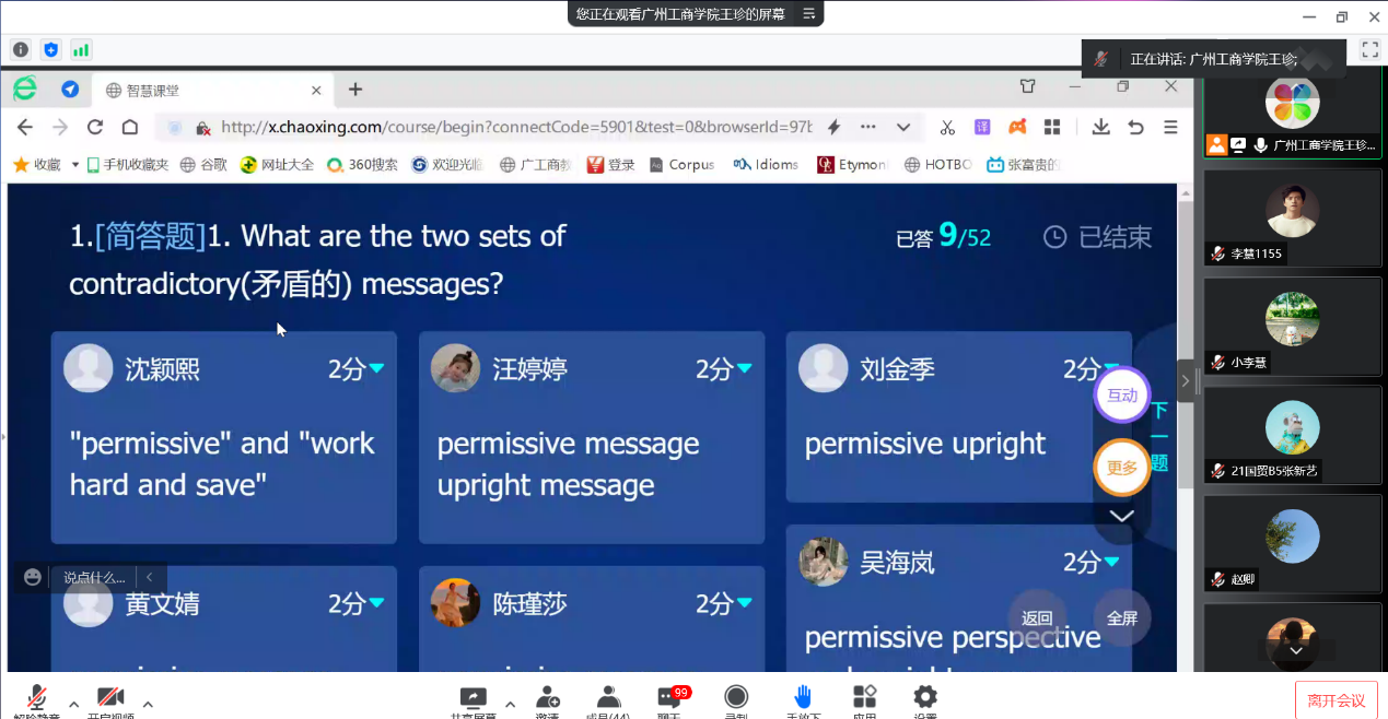 示范课主讲教师王珍是大学英语教研室的专任教师,具有丰富的教学经验,曾多次获得学院“优秀教职工”称号,深受学生喜爱。因考虑到疫情防护,示范课以线上的形式开展。王珍老师选取《大学英语II》课程的《新视野大学英语读写教程》第二册第五单元Text A进行示范授课,该单元课文主题是平衡消费与储蓄。王珍老师准备充分,对示范课的教学环节进行精心设计,从教学内容、教学目标、教学回顾、课文导入、段落内容讲解分析、小组讨论活动以及作业布置等方面,完整地呈现了示范课的流程。示范课利用生动形象的视频及学习通网络教学平台,充分调动学生参与课堂的积极性。示范课最大的亮点是课程思政元素的融入及充分体现,王珍老师通过课堂教学,除了让学生充分理解课文内容,同时加强学生的中国传统价值观,引导学生树立正确的消费观。