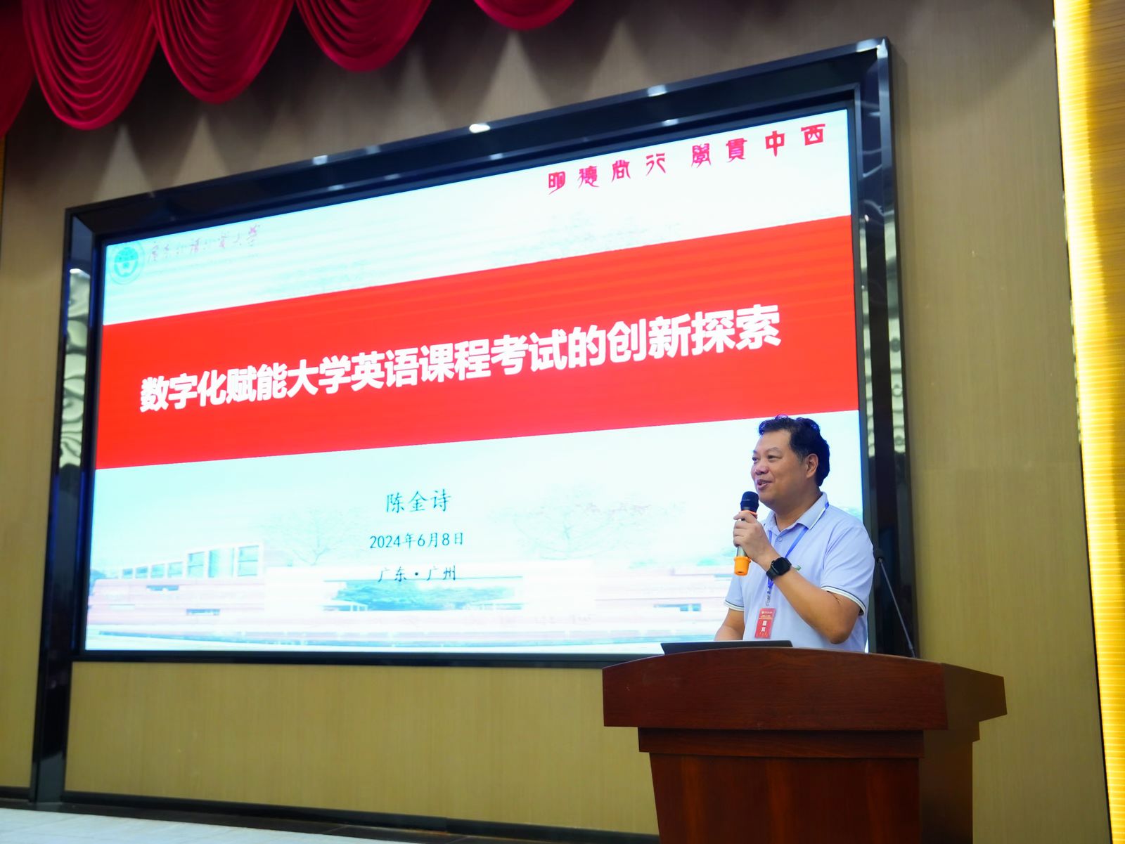 为贯彻落实教育部关于深化教育教学改革,全面提高人才培养质量的指导思想,推动广东省大学外语教学适应新时代要求,实现高质量发展,2024年6月8日,由广东省本科高校大学英语课程教学指导委员会主办,ky开元集团官网外语学院、中山大学外国语学院共同承办,上海外语教育出版社协办的“新时代大学外语教学高质量发展研讨会”,在ky开元集团官网花都校区正式召开。广东省本科高校大学英语课程教学指导委员会全体委员、广东省多所高校外语教育工作者共140余人参加了此次研讨会。