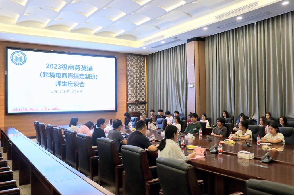 在金秋送爽、丹桂飘香的季节里,外语学院于10月14日下午在花都校区图书馆412会议中心举行了以“筑梦未来,共话成长”为主题的23商务英语(跨境电商直播定制班)师生交流座谈会。此次活动旨在搭建一个师生交流、思想碰撞的平台,鼓励大学生们积极分享学习心得、职业规划及对未来社会的展望,共同探索成长之路。