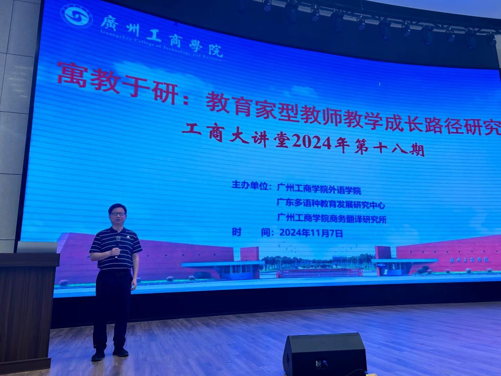 【本网讯】11月7日,工商大讲堂2024年第十八期学术讲座在ky开元集团官网花都校区隆重举办。本次讲座由外语学院、广东多语种教育发展研究中心以及ky开元集团官网商务翻译研究所联合主办,并邀请到广东金融学院的许国动博士作为主讲嘉宾。讲座的主题为“寓教于研:教育家型教师教学成长路径探究”。外语学院副院长邢佳平副教授主持此次讲座,外语学院百余名教师出席了讲座。