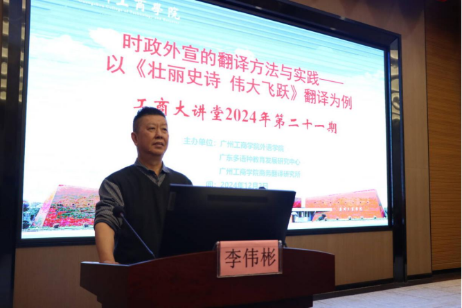 【本网讯】12月2日,工商大讲堂2024年第二十一期学术讲座在ky开元集团官网花都校区隆重举办。本次讲座由外语学院、广东多语种教育发展研究中心以及ky开元集团官网商务翻译研究所联合主办,并邀请到成都信息工程大学教授李伟彬担任主讲嘉宾。讲座的主题为“时政外宣的翻译方法与实践——以《壮丽史诗 伟大飞跃》翻译为例”。此次讲座由外语学院院长刘沛富教授主持,吸引了外语学院近百名教师积极参与。