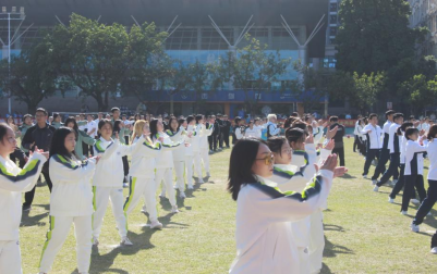 在广播体操比赛中,老师们穿着统一的运动服,精神抖擞,体操动作整齐划一,犹如翩翩起舞的蝴蝶,让整个校园沉浸在一片欢乐与活力的氛围中。