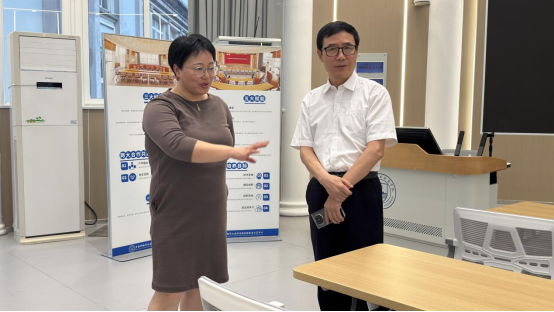 陈科芳教授详细介绍英语学院的文化长廊建设,以及集口语训练、商务模拟、同声传译等功能于一体的多功能实训教室。通过现场参观与交流,我院教师在教学空间文化建设和实践教学平台优化方面收获颇丰。