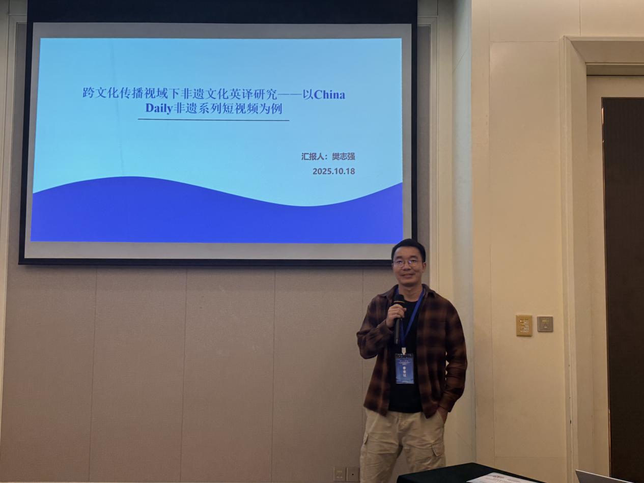 我院樊志强老师在分论坛2“AI背景下的翻译教学与人才培养”中作了题为《跨文化传播视域下非遗文化英译研究——以China Daily非遗系列短视频为例》的专题报告。报告基于拉斯韦尔的“5W”传播理论,从传播主体、传播内容、传播媒介、传播对象、传播效果五个方面,对China Daily非遗系列短视频的字幕英译进行研究,为中国非遗文化的跨文化传播与国际交流提供新的思路。