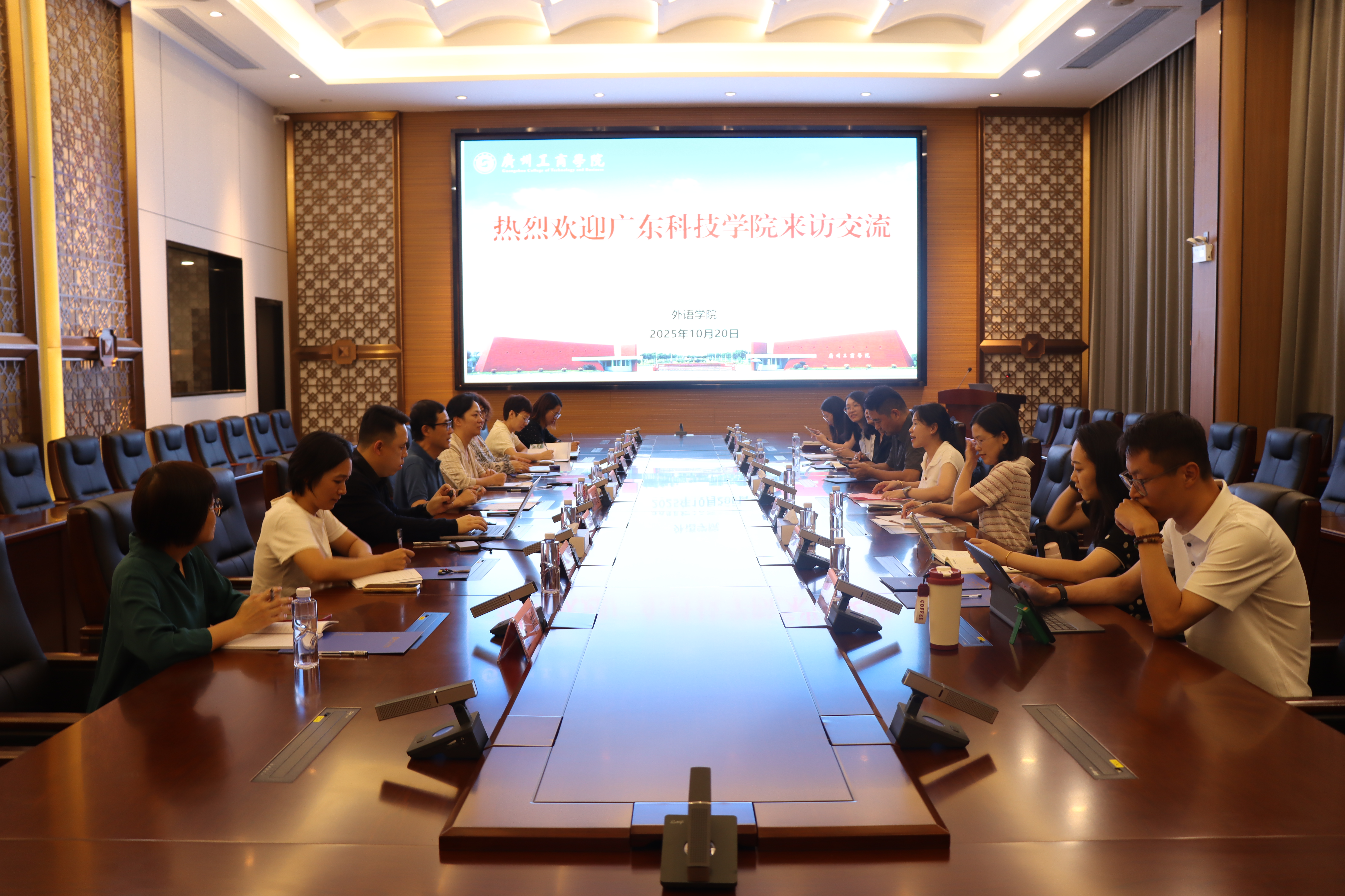 2025年10月20日下午,广东科技学院外国语学院院长邬帅率交流团一行8人莅临外语学院访问交流。外语学院院长刘沛富、副院长邢佳平、副院长高亮,以及商务英语专业建设负责人兼教研室主任、副主任等共同出席了本次交流活动。
