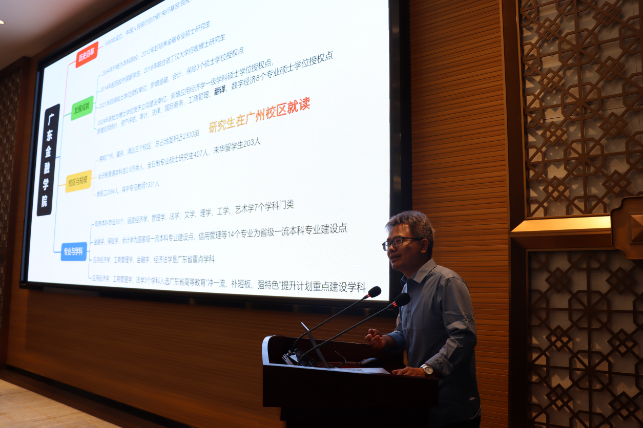 刘春江博士在介绍广东金融学院翻译硕士点时,系统阐述了项目的发展背景与人才培养特色。他指出,该硕士点依托广州金融与语言服务产业集群资源,立足广州校区,着力打造“金融+语言服务”的复合型人才培养路径。在备考方面,学院为考生提供统一的考试大纲和指定参考教材,降低备考不确定性;在培养支持方面,通过设立奖学金激励机制,明确评选标准和金额,鼓励学生以优异成绩争取资助。同时,依托校企合作平台建设翻译实践基地,提供丰富兼职机会,构建“奖助—实践—就业”一体化支持体系,助力学生实现从学术训练到职场能力的高质量衔接。