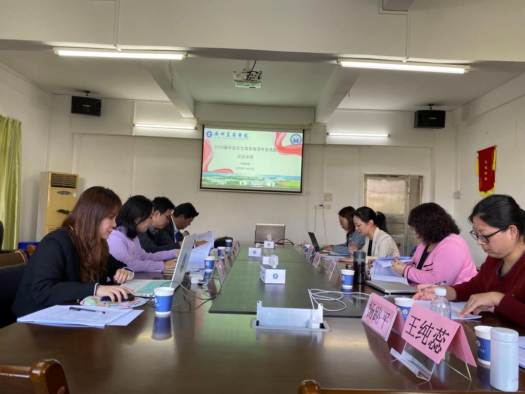 11月23日下午,外语学院在外语楼301会议室召开2026届商务英语专业毕业论文选题论证会。会议特邀广东外语外贸大学教务部部长陈金诗教授、广东金融学院陈树坤教授、唐姗副教授及广东培正学院张妤教授四位校外专家莅临指导,对本届商务英语专业全体学生的毕业论文选题进行全面审核与专业论证。