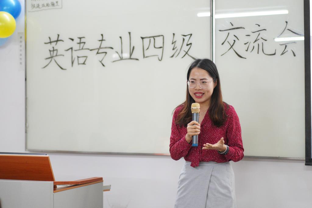 本次专业英语四级交流会以”鲲鹏展翅凌万里,筑梦扬帆战专四”为主题,在主持人进行简洁凝练的开场白后,外语系冯伟婷老师对专四考试的概况做了详尽的讲解,冯伟婷老师殷切希望同学们能通过这次专业英语四级交流会活动更加了解英语专业四级考试的重要性,并以此为动力努力提高专业水平。随后,外语系冯华明老师为与会同学带来了专四考试的解题技巧,冯华明老师重点提出,英语学习与考试,重要的是要有充足的自律性,只有有效规划自己的时间,才可以进入有节奏的英语学习生活中。老师讲解结束之后,外语系文娱部在中场休息时为同学们带来了英文歌曲暖场表演,让同学们以轻松的姿态进入学长学姐交流环节。