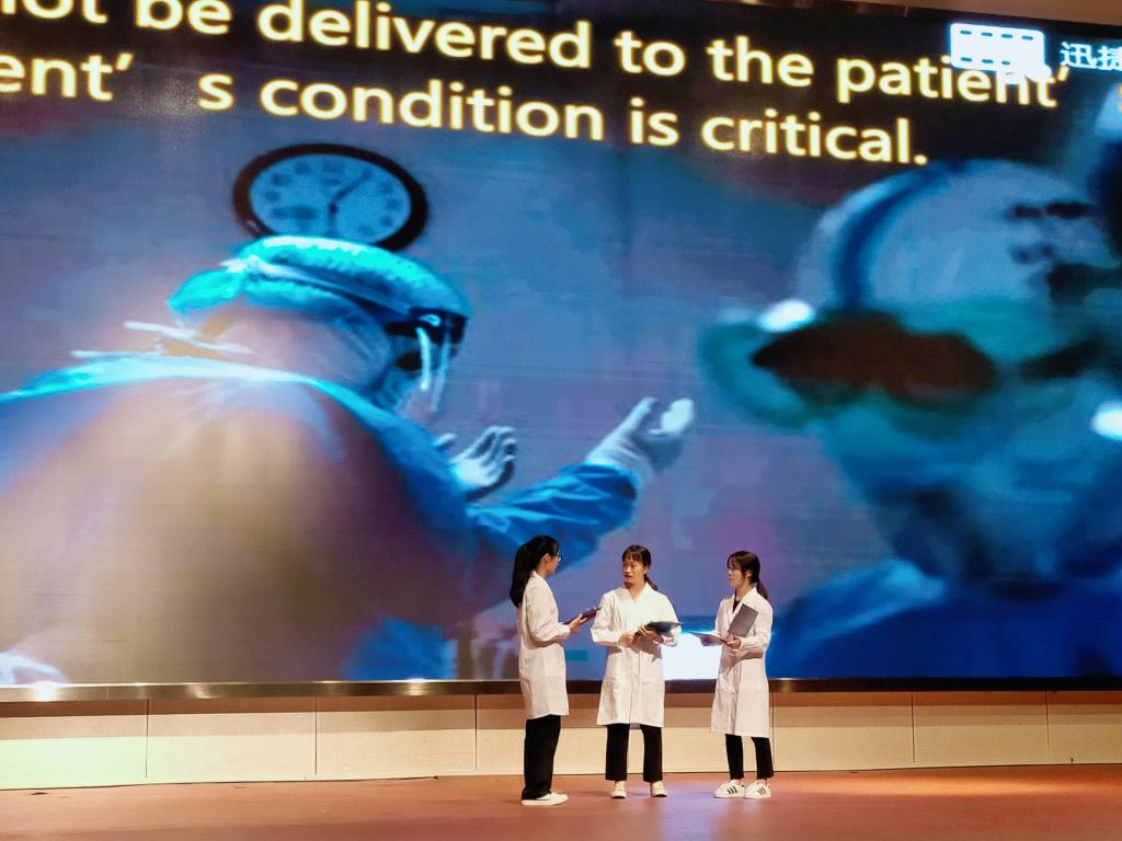 在主持人简单的开场白之后,外文话剧大赛正式拉开帷幕。外语系学生会文娱部梁晓菁同学带来的开场表演歌曲《Oops》,为现场创造了气氛,在掌声雷动的气氛下,进入决赛的优秀话剧作品纷纷登上舞台,在绘声绘色的演绎中,克时艰、共抗疫的主旋律被表达的淋漓精致,疫情期间的感人事迹带来的视觉和精神冲击扑面而来,令人久久不能忘怀。外语系文娱部带来的中场舞蹈表演《attentionattention&mago》,令现场的感动和温暖深深扎根进每位观众和评委心里。决赛的最后,评委余慕英老师和张文倩老师对7个团队的作品进行了点评和颁奖,老师们对本次话剧大赛的丰富内容和精彩呈现表达了肯定,对话剧大赛的圆满结束表达了祝贺。